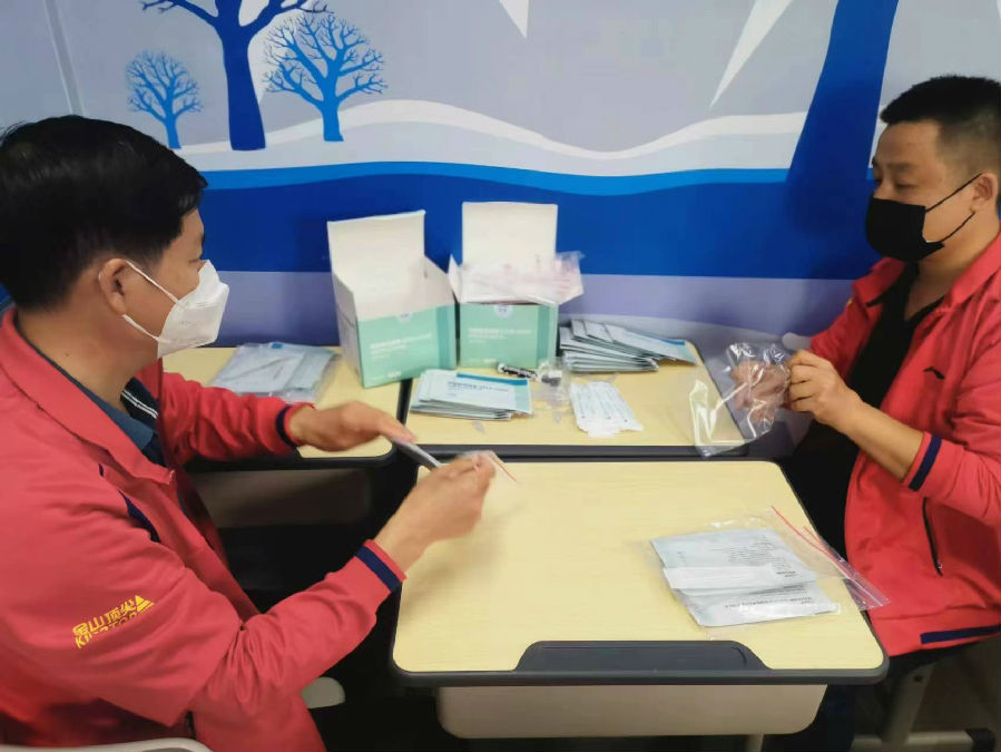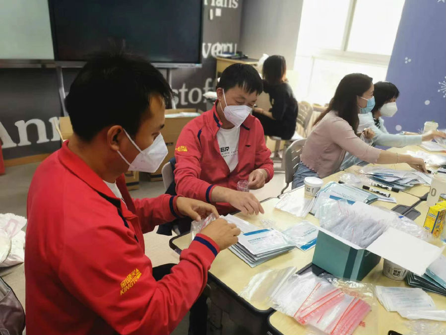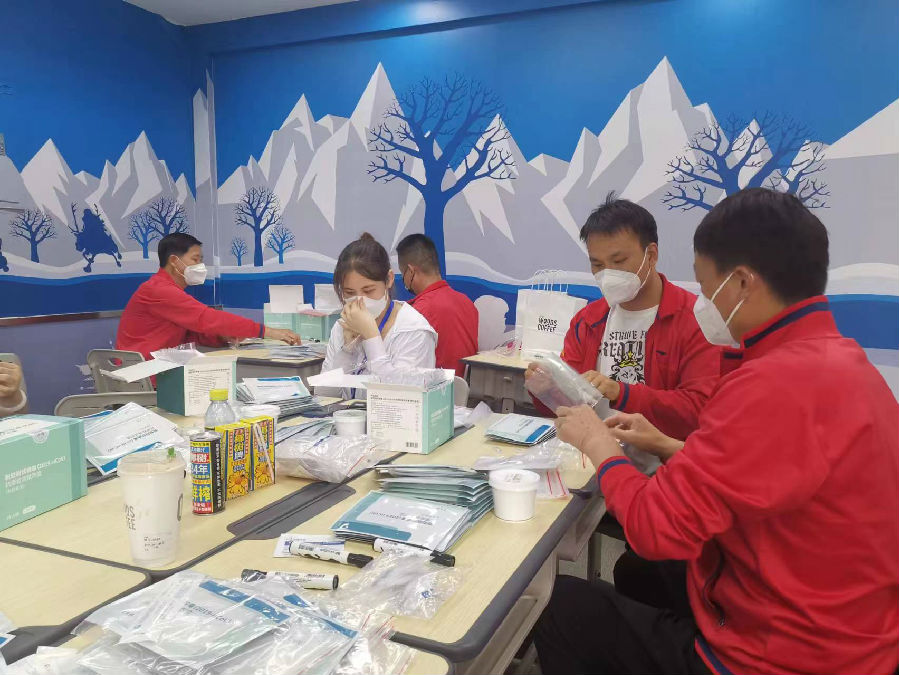 得知海淀區中關村街道疫情突現、形勢嚴峻,5月17日,金山頂尖主動聯系疫情所在的中關村街道科匯社區居委會,詢問需求,迅速集結志愿者趕赴社區支援服務。5月17日、18日兩天已派出志愿者8人次,按社區安排助力現場,參與2萬余件抗原檢測試劑盒分裝工作。志愿者們認真、有序、高效的工作,獲得了社區的好評。