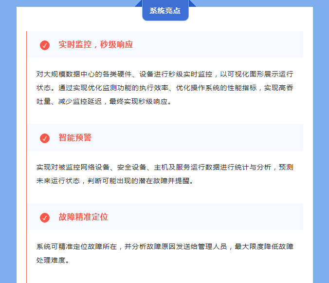 數據中心智慧管理平臺是北京金山頂尖科技股份有限公司依據多年對大型數據中心運維的經驗,逐步提煉和凝結出代表當今最新運維理念的產品。目前產品已在多個大型機房穩定應用多年,極大地提升了用戶機房運維管理的智能化水平,使原來錯綜復雜的運維管理工作變得簡單和輕松,真正實現了職責分明、安全高效、穩定可靠、智能管控的目標。